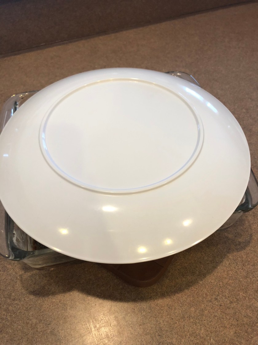- Place baking sheet or inverted plate over pan so contained heat will melt the chocolate.