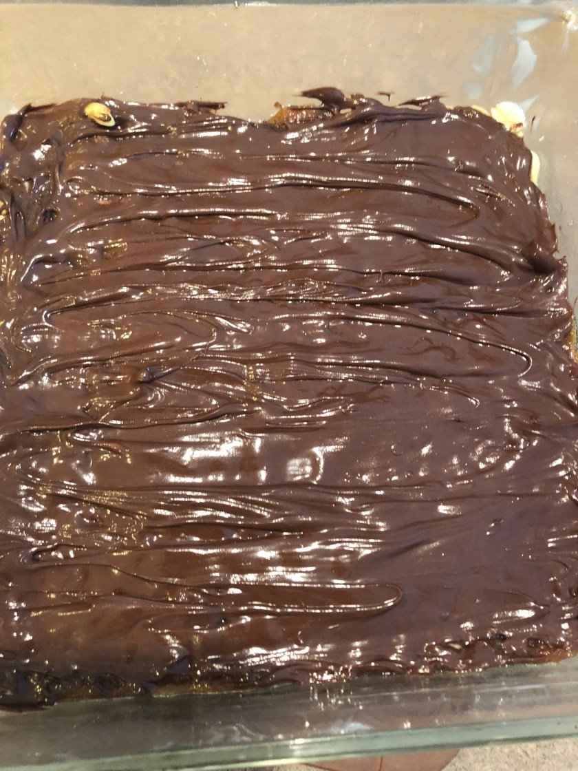 In 15 minutes I had a container of toffee bars cooling on the counter. The Toffee recipe is listed below and I took a few pictures of the process. It really was easy – except for 7 minutes of stirring- and now the whole house smells caramelized and chocolatey! I used dry roasted peanuts instead of pecans – this candy is tasty without nuts if you so desire!! I recommend you give this recipe a try.